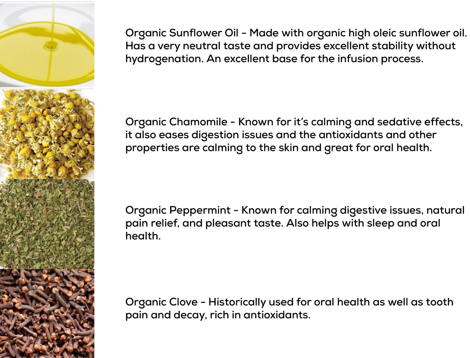 Teething Oil ingredients: helianthus annuus (sunflower) oil, proprietary blend of matricaria chamomile (chamomile), syzygium aramaticum (clove), mentha piperita (peppermint). NOTE: Should your baby drink a whole bottle of teething oil, simply ensure that they stay hydrated and be aware that their stool may be looser than usual for the next day or so.